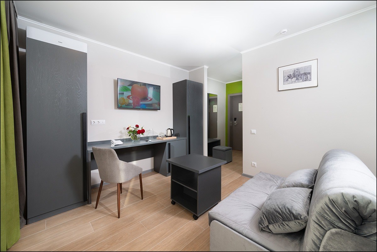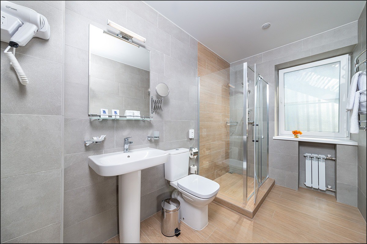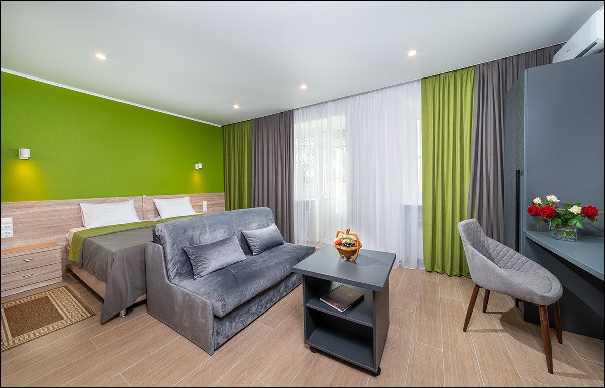 Площадь номера - 20 кв.м. 2 осн. места. 2 доп. места. Балкон. Мебель: вешалка, диван, зеркало, кровати односпальные, прикроватные тумбочки, стол, стулья, шкаф. Оборудование: кондиционер, телевизор, холодильник. Санузел: с душем, туалетные принадлежности. Сервис: смена полотенец (1 раз в 3 дня), смена постельного белья (1 раз в 7 дней), уборка номера (ежедневно).