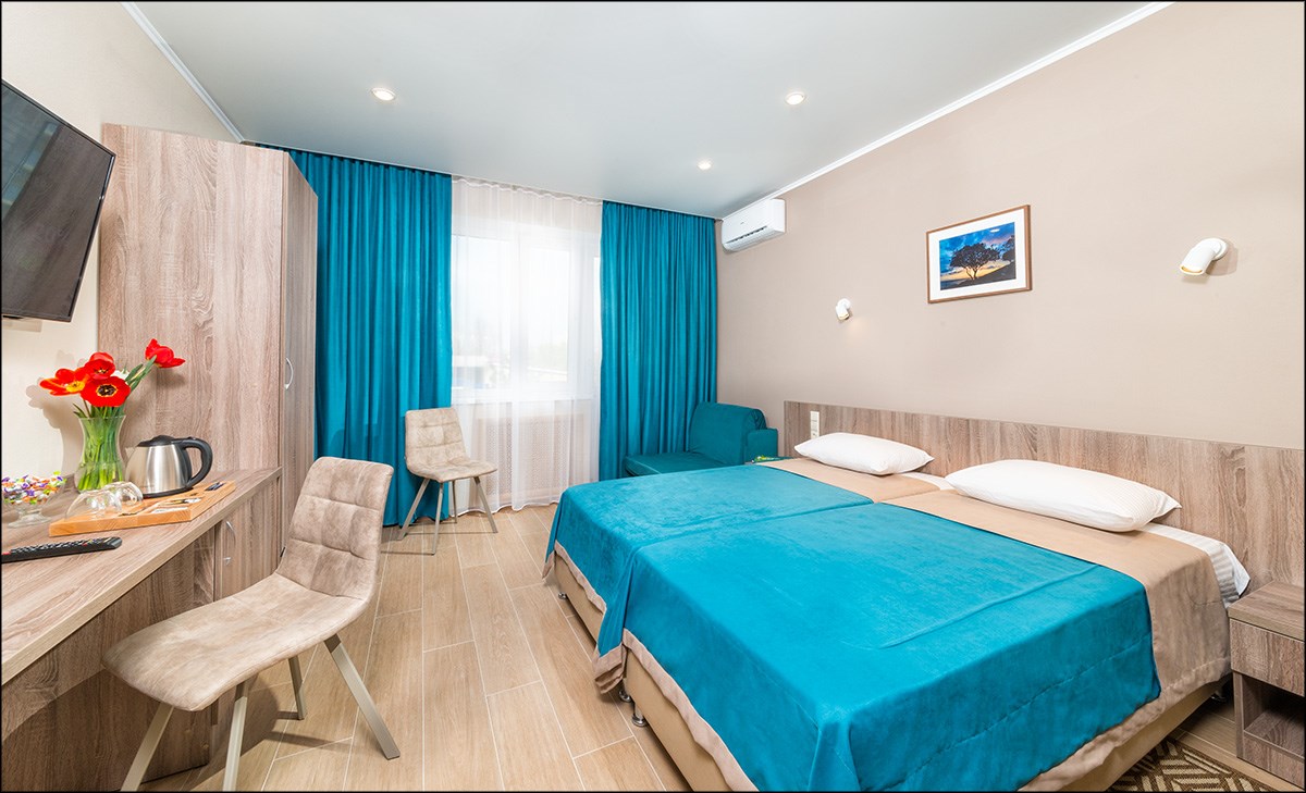 Площадь номера - 18 кв.м. 2 осн. места. 1 доп. место. Балкон. Мебель: вешалка, зеркало, кресло, кровати односпальные, прикроватные тумбочки, стол, стулья, шкаф. Оборудование: кондиционер, телевизор, холодильник. Санузел: с душем, туалетные принадлежности. Сервис: смена полотенец (1 раз в 3 дня), смена постельного белья (1 раз в 7 дней), уборка номера (ежедневно).