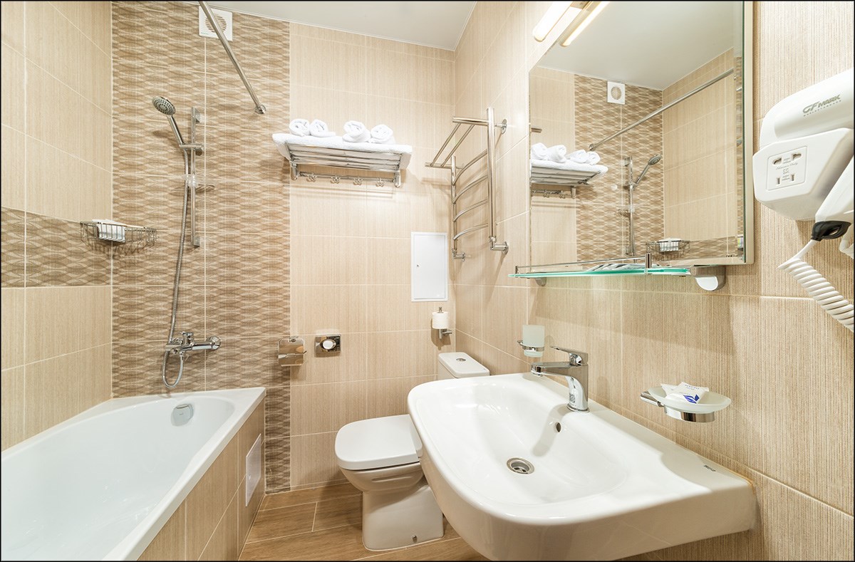 Площадь номера - 18 кв.м. 2 осн. места. 1 доп. место. Балкон. Мебель: вешалка, зеркало, кресло, кровати односпальные, прикроватные тумбочки, стол, стулья, шкаф. Оборудование: кондиционер, телевизор, холодильник. Санузел: с душем, туалетные принадлежности. Сервис: смена полотенец (1 раз в 3 дня), смена постельного белья (1 раз в 7 дней), уборка номера (ежденевно).