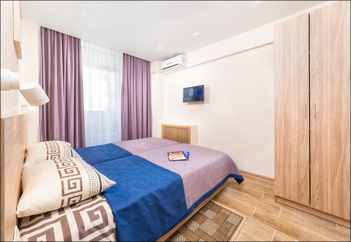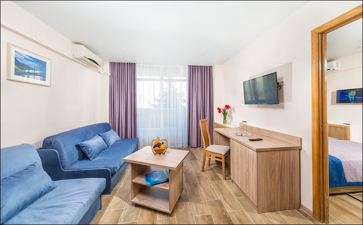 Площадь номера - 24 кв.м. 2 осн. места. 3 доп. места. Балкон. Мебель: вешалка, диван, зеркало, кресло, кровати односпальные, прикроватные тумбочки, стол, стулья, шкаф. Оборудование: кондиционер, телевизор, холодильник. Санузел: с душем (поддон), туалетные принадлежности, фен. Сервис: смена полотенец (1 раз в 3 дня), смена постельного белья (1 раз в 7 дней), уборка номера (ежедневно).